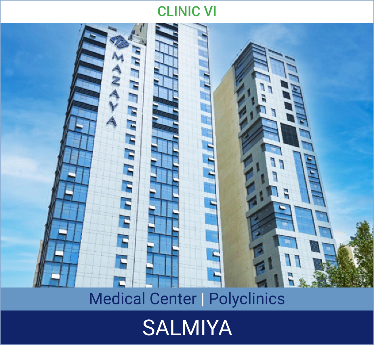تقع عيادة مزايا السادسة في منطقة السالمية في الكويت على مساحة تقارب 3554 مترًا مربعًا، وتتكون من برجين، البرج الأول (رقم 35) بارتفاع 23 طابقًا، ويتكون كل طابق من عيادة واحدة بمساحة 180 مترًا مربعًا، والبرج الثاني (رقم 41) بارتفاع 24 طابقًا، ويتكون كل طابق من عيادتين، بمساحة تتراوح بين 171 و142 مترًا مربعًا.