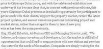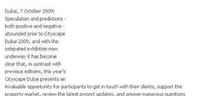 Speculation and predictions – both positive and negative – abounded prior to Cityscape Dubai 2009, and with the celebrated exhibition now underway it has become clear that, in contrast with previous editions, this year’s Cityscape Dubai presents an invaluable opportunity for participants to get in touch with their clients, support the property market, review the latest project updates, and answer numerous questions concerning project and market status, rather than a stage for them to launch new projects as has been the norm previously.