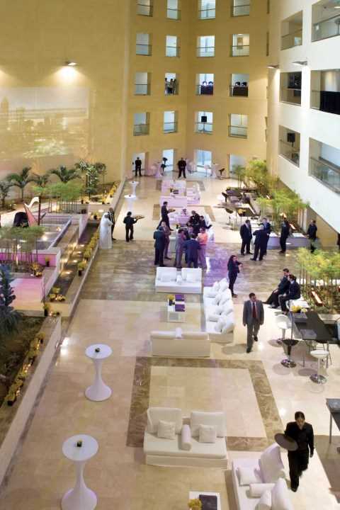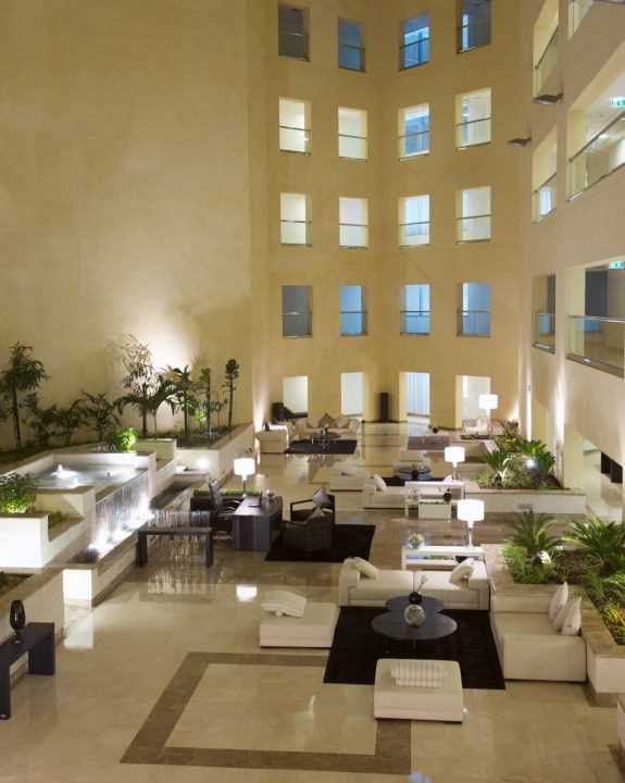 The sweeping lines of the lobby enclose a verdant oasis of trees, palms and benches, creating a place of peace and tranquility in which to enjoy a coffee, read a paper or simply to sit and relax. At the heart of the building is a central reception desk that floats above the iridescent pools with solid stone stanchions soaring 160 meters into the sky.